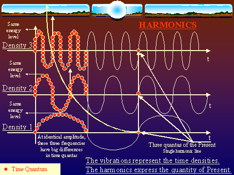 In developing temporal quantas,one can measure the differences of density. One crosses from one density toanother by the line (axis) of the present, that is through the points ofvibratory harmonics. To represent the Present (P-Time) in a geometrical way,imagine if one second were the distance of the Earth from the Sun, the Presentwould not even be visible with the best microscope in the world. It is not sosurprising that we can miss billions of temporal quantas every second. It iswith this that the importance of psychological time can be realised, the same aswith dreams, a state signifying a vibratory increase.