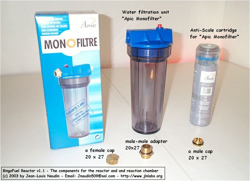 Le BingoFuel Reactor v1.1 utilise du matériel courant qui peut-être facilement trouvé dans toutes les magasins de bricolage, il n'y a pas de pièces à usiner et aucun outil spécial est nécessaire. La pièce principale utilisée est un simple dispositif de filtration d'eau équipé de sa cartouche anti-calcaire ( regardez la photo ci-dessous ).