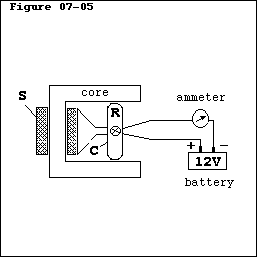 Le flux qui augmente induit une tension contraire dans le solénoïde qui, entre les positions 1 et 2, maintient le courant de ce dernier à une très faible valeur. Au départ de la rotation, le courant est à environ0,2ampères (en raison de la résistance en ohms de la bobine). Si l’aimant tourne à environ100tours / minute, alors, le courant (entre les positions 1et 2) est de0,02ampères environ. Nous pouvons remarquer que même avec ce faible courant , l’intensité magnétique de la bobine travaille dans des conditions favorables, comme le montre la Fig. 07.06.