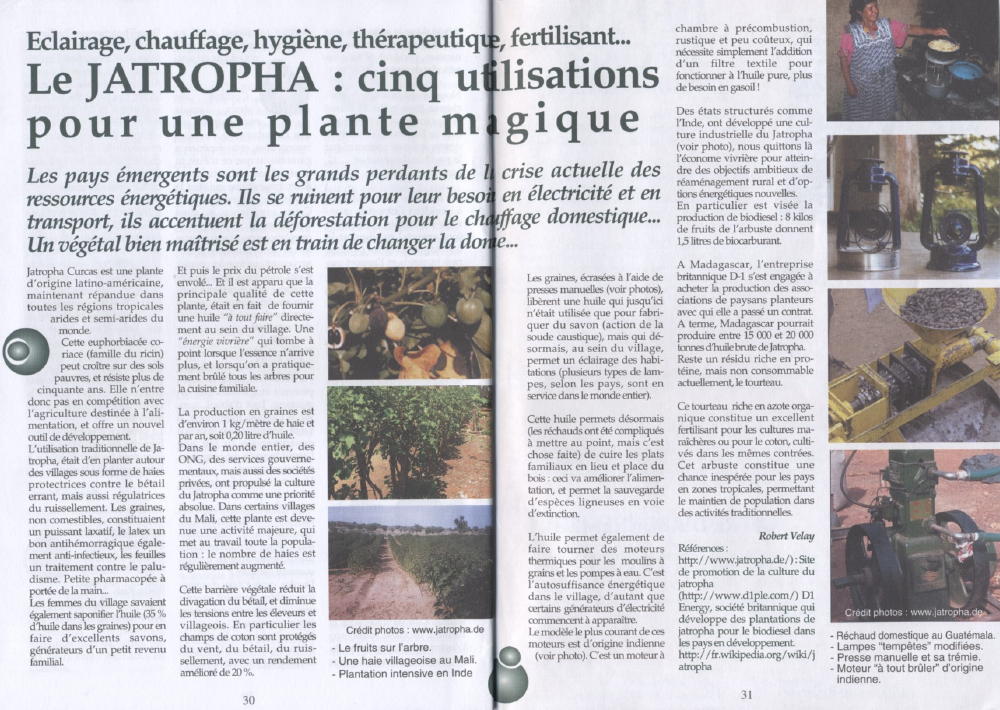 Merci Olivier pour cette info ! De l'essence à partir de déchets "Au Japon, les industriels du raffinage et de la pétrochimie Idemitsu Kosan Co. et Zeon Corp. développent des technologies pour convertir des sous-produits en matière première pour fabriquer de l'essence ou des matières plastiques. L'objectif est à la fois de réduire les émissions de CO2 et les coûts grâce à une meilleure efficacité. Actuellement, ces sous-produits gazeux sont utilisés pour produire de la chaleur. En améliorant l'efficacité des procédés de tous les sites des 2 sociétés au Japon, il serait possible de réduire la consommation de pétrole de 330 millions de litres par an et les émissions de CO2 de 900.000 tonnes par an. Sur le site pétrochimique de Suchan, Idemitsu Kosan a construit avec Zeon une unité de collecte d'hydrocarbures gazeux de gaz de butène, transformé en essence et en solvant industriel. Le site produit 25 millions de litres d'essence par an. Pour la même production, la nouvelle technologie économise 8,4 millions de litres de pétrole et évite l'émission de 27200 tonnes de CO2. D'autres industriels, Kashima Oil Co. et Mitsubishi Chemical Corp. ont développé un prototype pour récupérer l'éthylène et le propylène qui se trouve dans les gaz inflammables issus des procédés de raffinage, pour fabriquer des matières plastiques. Cette technologie devrait permettre de réduire la consommation de pétrole de 2,1 millions de litres et d'éviter 5600 tonnes d'émission de CO2." source : documents de Bruno Bartnicki dans : Energie et Développement Durable n° 18 - septembre-octobre 2007 Développement de la culture du jatropha