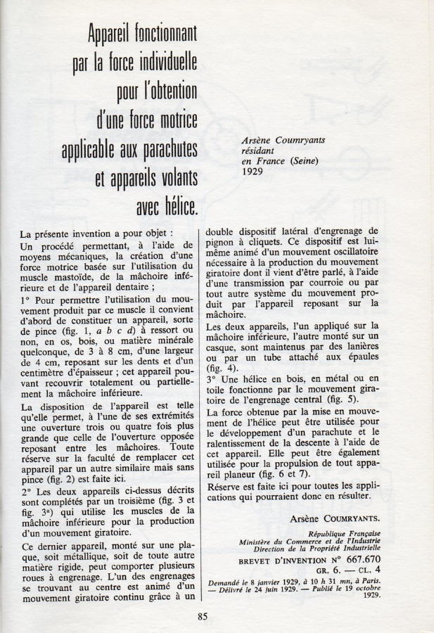 Appareil permettant de récupérer et de transformer en énergie les 23000 mouvements d'expression respiratoire- Brevet 1.198.400 - 1958