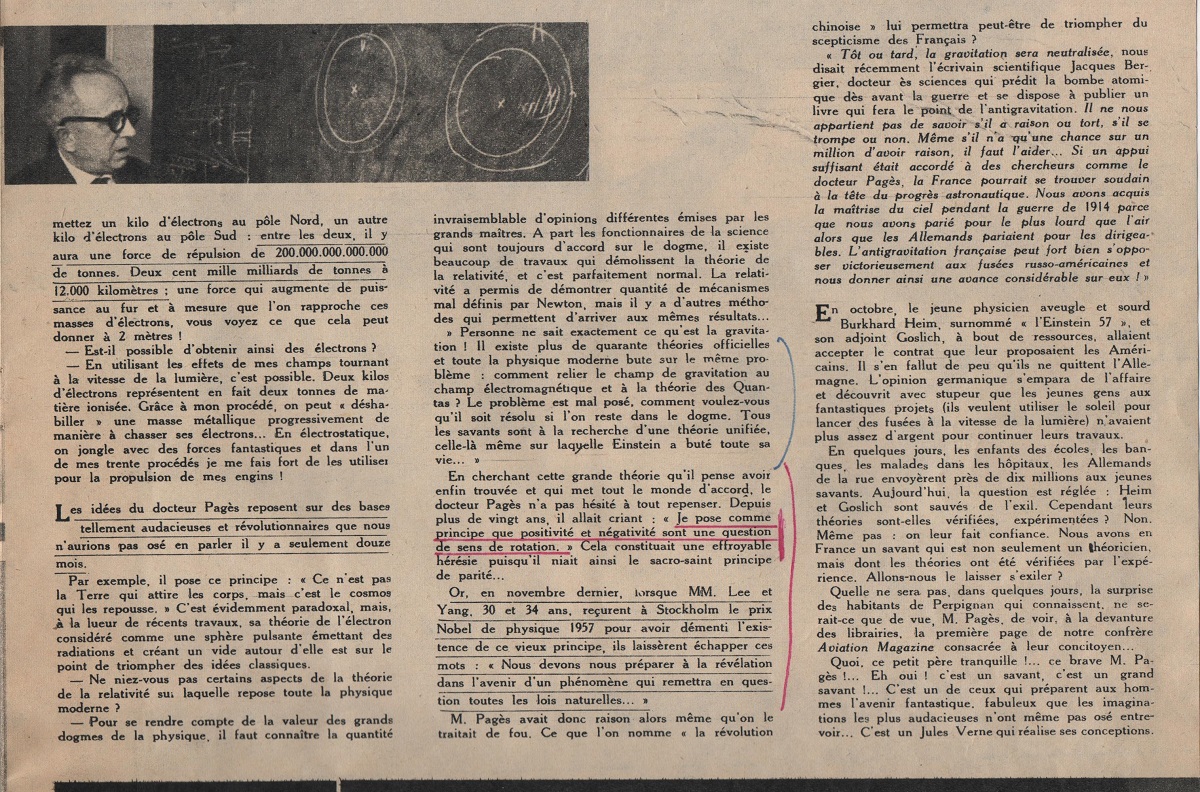 Un texte de 1958 de Jimmy Guieu - Un article Sciences 57 paru dans Le Provençal - L'article du 7 février 1958 de Point de Vue Images du Monde - L'article du 3 mai 1958 de Match - L'article du 15 mai 1958 paru dans Aviation Magazine - L'article du 18 mai 1958 de La Dépêche du Midi - La transcription d'une Interview du Docteur Marcel Pagès Président de France - Gravitation