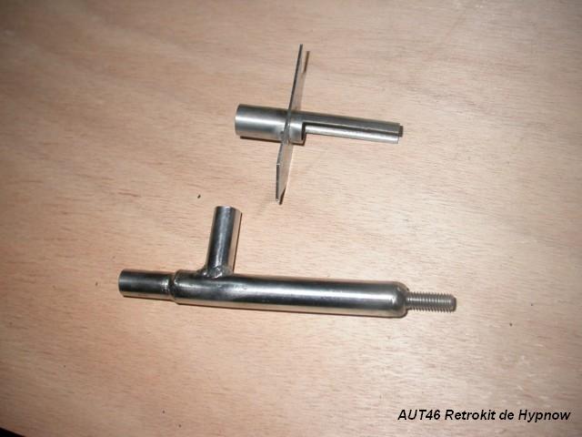 La tige du réacteur est en acier inoxydable 310 de 16 cm de longueur, son Ø est de 15mm. Le tube du réacteur est également en acier inoxydable laissant un jeu entre tige et tube de 1,30mm. La tige est centrée à chaque extrémité par trois pions soudés à 180°. Deux coudes seront soudés sur le tube, le tout est mis en place dans le tube d’échappement au plus près du collecteur. Les liaisons bulleur/réacteur et réacteur/diffuseurs se feront avec de la durite silicone dont une des particularités est de bien résister aux températures élevées. |