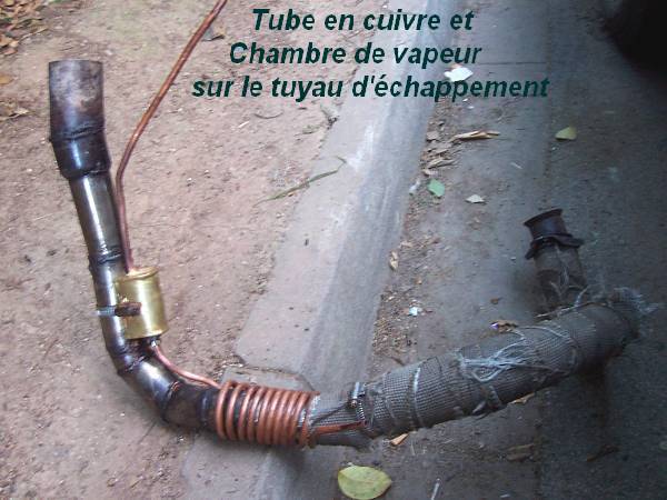 Un tube de petit diamètre (pour mon V8 j'ai utilisé du diamètre 8mm) en cuivre, recuit, (dans lequel circule l'eau) enroulé autour du tuyau d'échappement en sortie de collecteur, et relié à la chambre de vapeur.